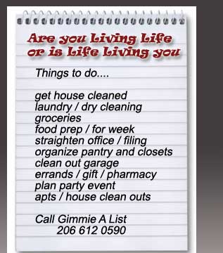 Personal Assistance Bellevue Washington Gimmie a List home services Bellevue and is your Dream come true for someone that needs cloning or duplicating. Whether you need a wife in Bellevue, A mother in Bellevue, or just call us a partner. Ladies if you’re a busy mother in Bellevue, well we are there to save you busy Lady. RELAX!!! If you’re a professional and a mother in Bellevue and working right along with your husband OR it’s just you. You’re working so hard in Bellevue to do everything for everyone else with rarely a moment for yourself.